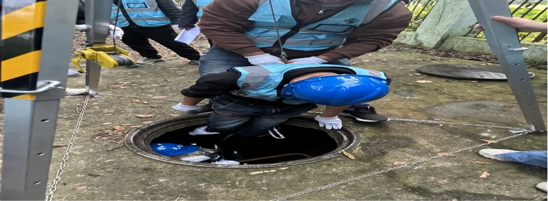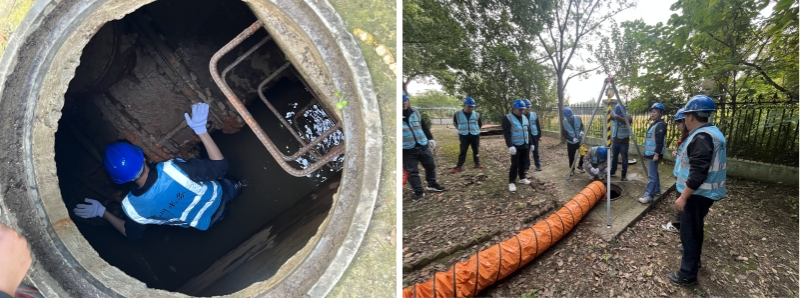 隨著演練正式開始,演練人員在閥門井口發(fā)現(xiàn)有人違規(guī)操作,入井倒地。指揮組接到匯報,命令啟動有限空間應(yīng)急搶修預(yù)案,并趕往現(xiàn)場。同時保障組攜帶鼓風(fēng)機、安全繩、呼吸器等安全設(shè)施進入現(xiàn)場。站長到達閥門井后,使用空氣監(jiān)測儀,并不間斷匯報檢測數(shù)據(jù)。搶修組進入現(xiàn)場后,穿戴防護用具。