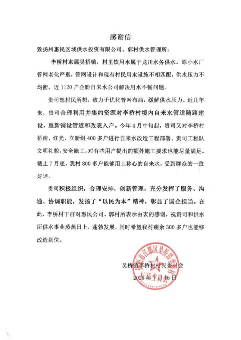 “感謝惠民區域供水公司心系百姓,解決了我們村組多年來的用水難題,現在家家戶戶都用上了干凈、穩定的自來水,日子越過越舒心!”近日,揚州市惠民區域供水投資有限公司收到了一封來自郭村供水管理所轉達的吳橋鎮李橋村村民委員會送來的代表帶著全村人心意、飽含深情的感謝信,字里行間滿是對解決用水難題的感激。